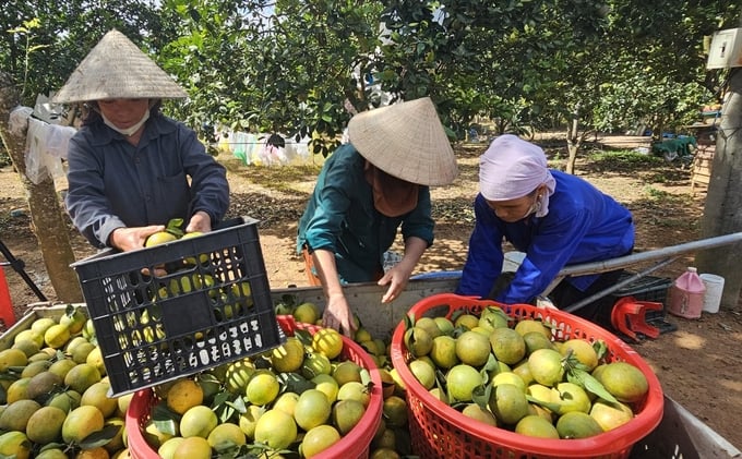 Cam ở trang trại gia đình ông Bế Văn Mai được thương lái đặt hàng mua tại vườn. Ảnh: Tâm Đức.