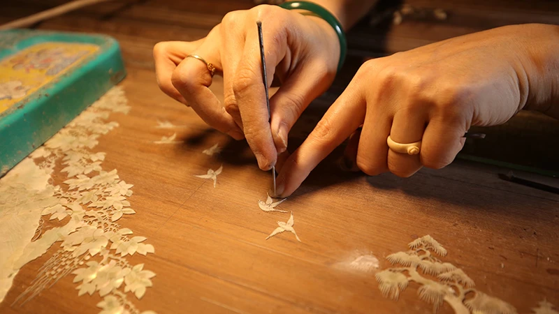 Lao động làm sản phẩm truyền thống tại làng nghề khảm trai Chuyên Mỹ, huyện Phú Xuyên, Hà Nội. (Ảnh: DUY KHÁNH)