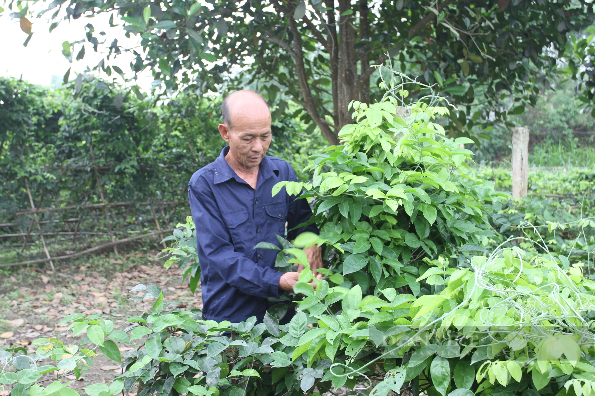 Ông Nguyễn Đức Hiền, xóm Mỹ Khánh, xã Phấn Mễ, huyện Phú Lương, tỉnh Thái Nguyên trồng sâm nam, tận dụng lá làm thức ăn cho hươu trong khi chờ thu hoạch hoa và củ. Ảnh: Hà Thanh