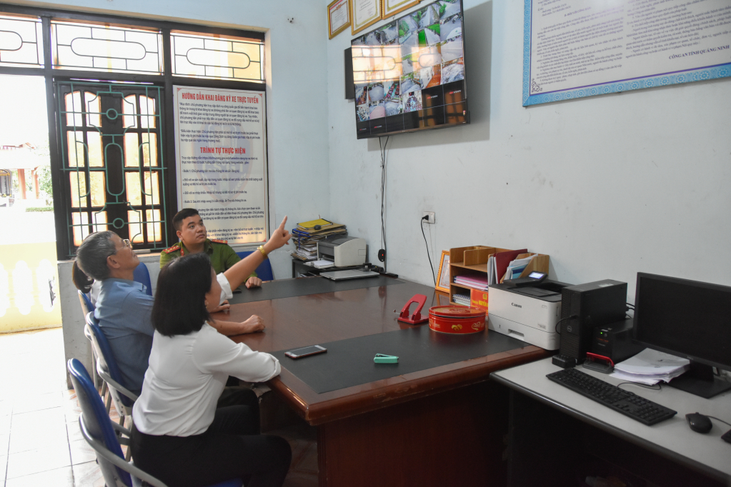 Cán bộ MTTQ phường Hoàng Quế (TX Đông Triều) phối hợp kiểm tra hoạt động của mô hình camera công cộng, kết nối trực tiếp hình ảnh về trụ sở Công an phường.