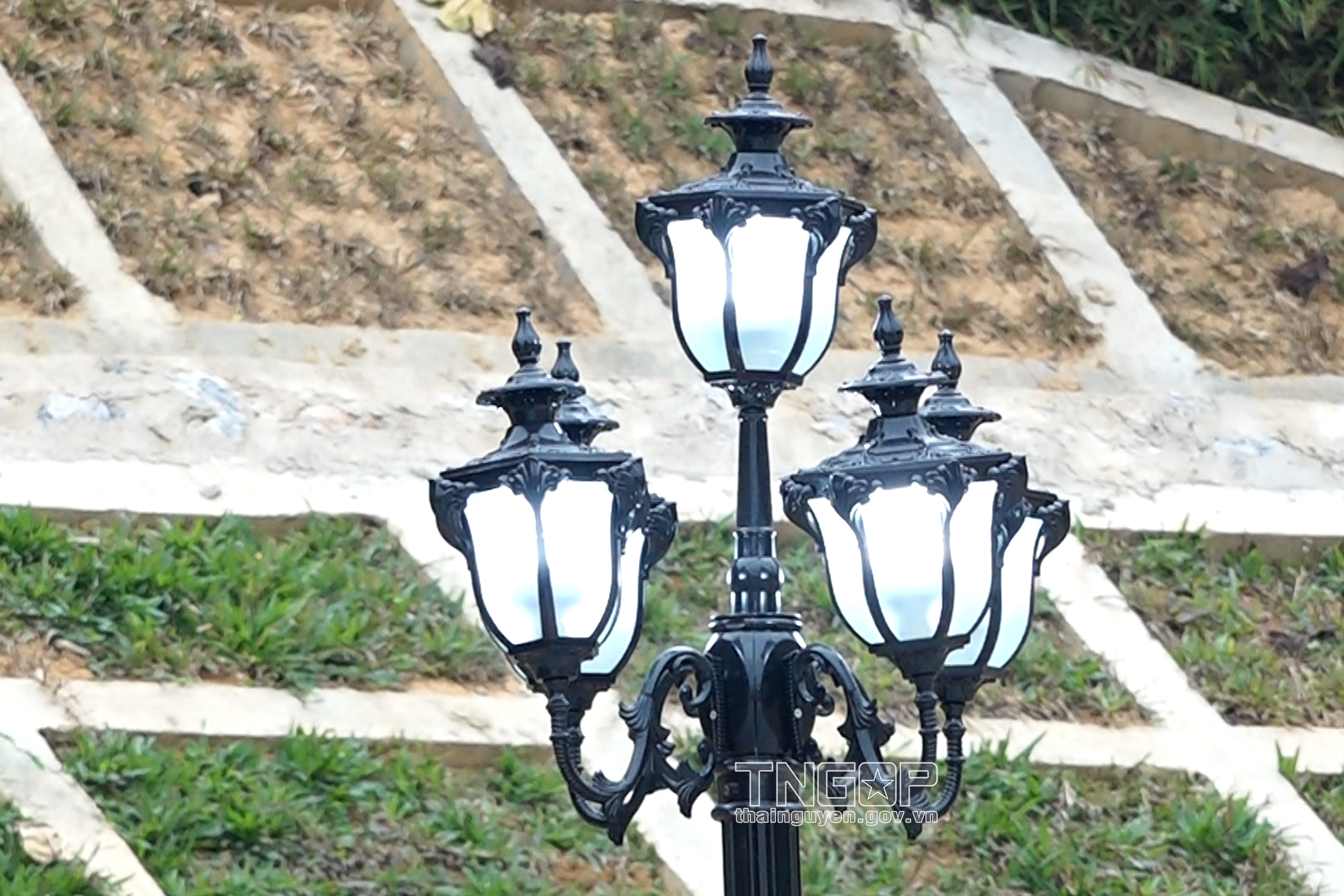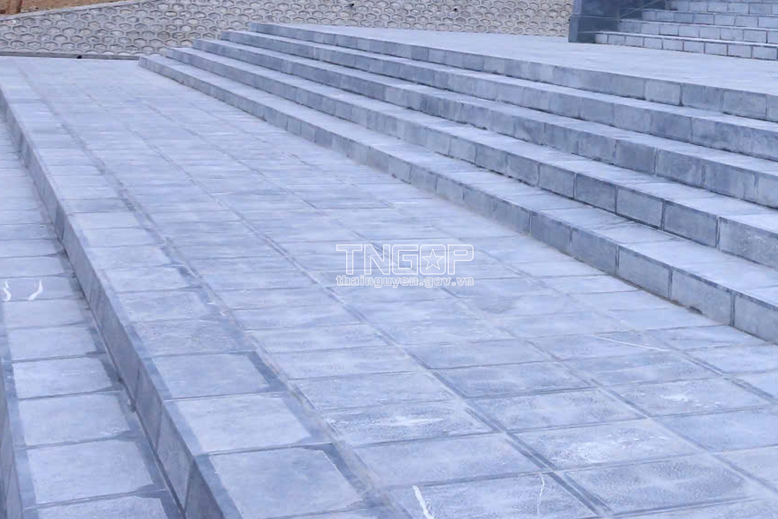 Vo Nguyen Giap 장군 기념관 뒤에 콘크리트 보조제방을 건설하고 잔디를 심고 경관을 조성하고 산사태를 방지하며 조명 시스템이 조화롭고 아름답게 설치되었음