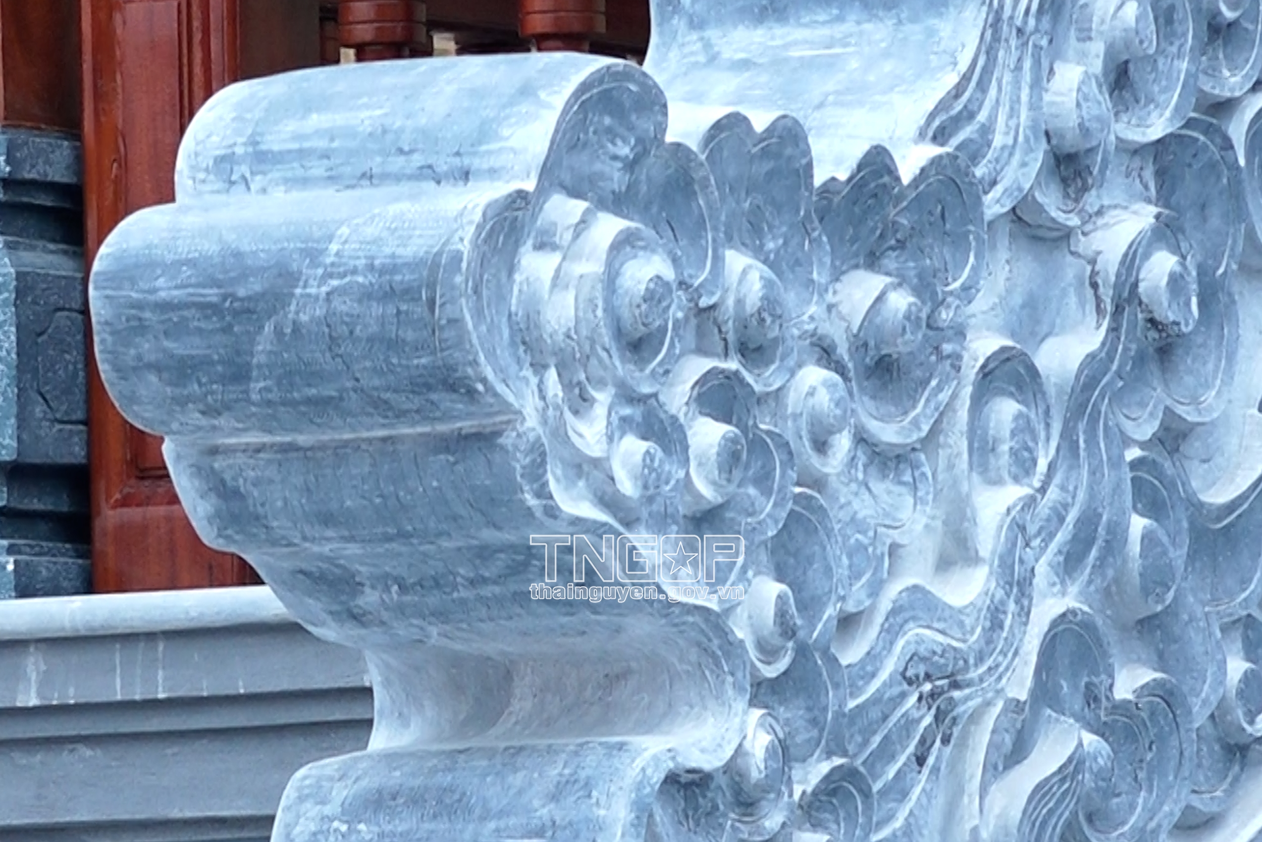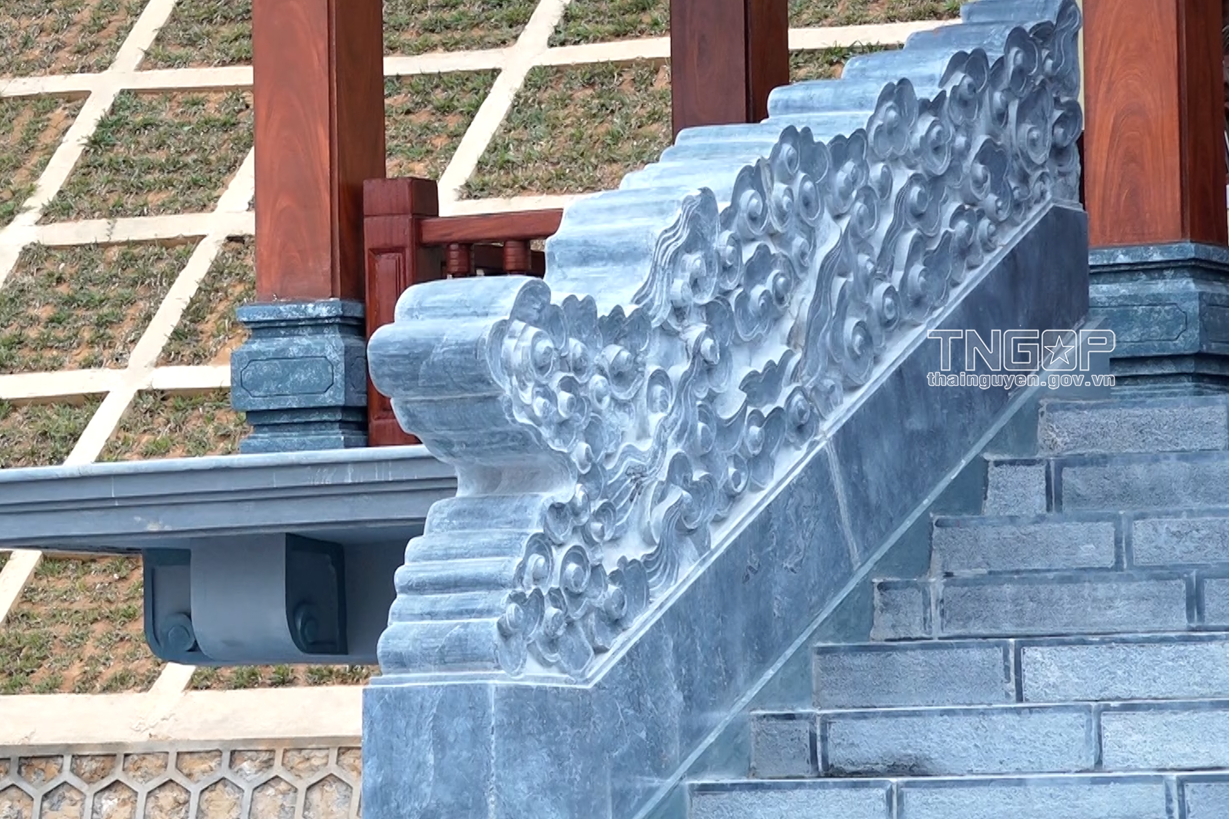 기념관 앞에 섬세하고 아름다운 녹색 돌 용 형상이 새겨진 난간이 있음
