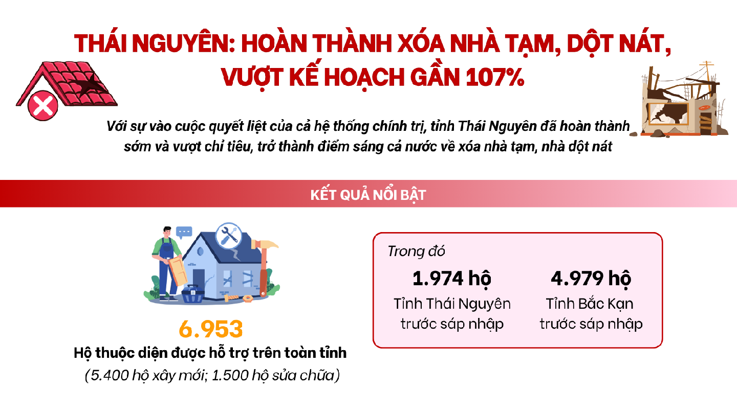 Với quyết tâm chính trị cao, cách làm sáng tạo và sự vào cuộc đồng bộ của cả hệ thống chính trị, tỉnh Thái Nguyên đã khởi công toàn bộ số nhà theo kế hoạch xóa nhà tạm, nhà dột nát cho các hộ nghèo, cận nghèo và gia đình chính sách trên địa bàn. Đây là kết quả của quá trình triển khai khẩn trương, hiệu quả, thể hiện tinh thần “không để ai bị bỏ lại phía sau” trong phát triển kinh tế - xã hội sau sáp nhập đơn vị hành chính cấp tỉnh.