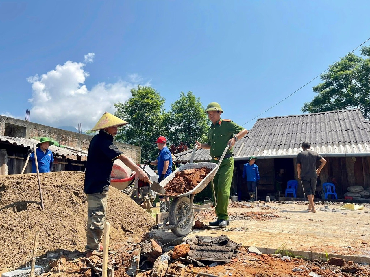 Các lực lượng Công an, Đoàn Thanh niên xã Cao Minh hỗ trợ người dân làm nhà