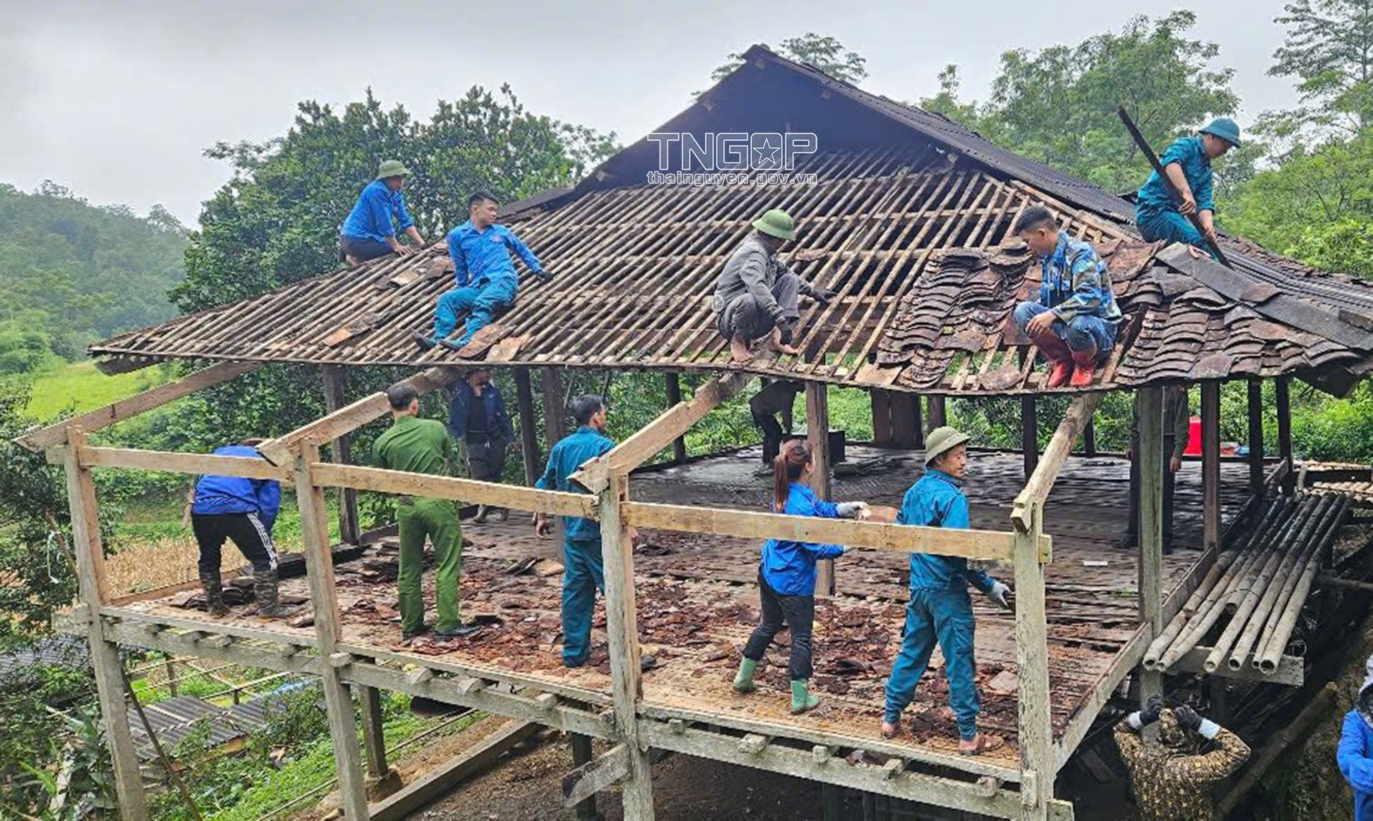 Các lực lượng tham gia hỗ trợ dỡ nhà tạm của hộ gia đình ông Hoàng Văn Tộ, thôn Cốc Càng để chuẩn bị xây dựng ngôi nhà mới kiên cố, vững chắc hơn