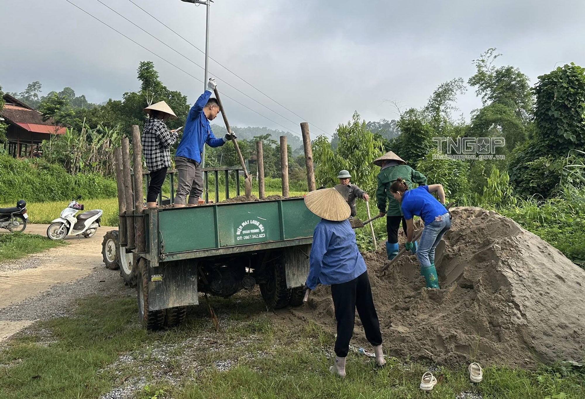 Đoàn viên thanh niên và người dân tham gia hỗ trợ đổ bê tông mái nhà ông ông Lý Văn Khoa, thuộc đối tượng gia đình người có công với cách mạng tại thôn Cốc Càng