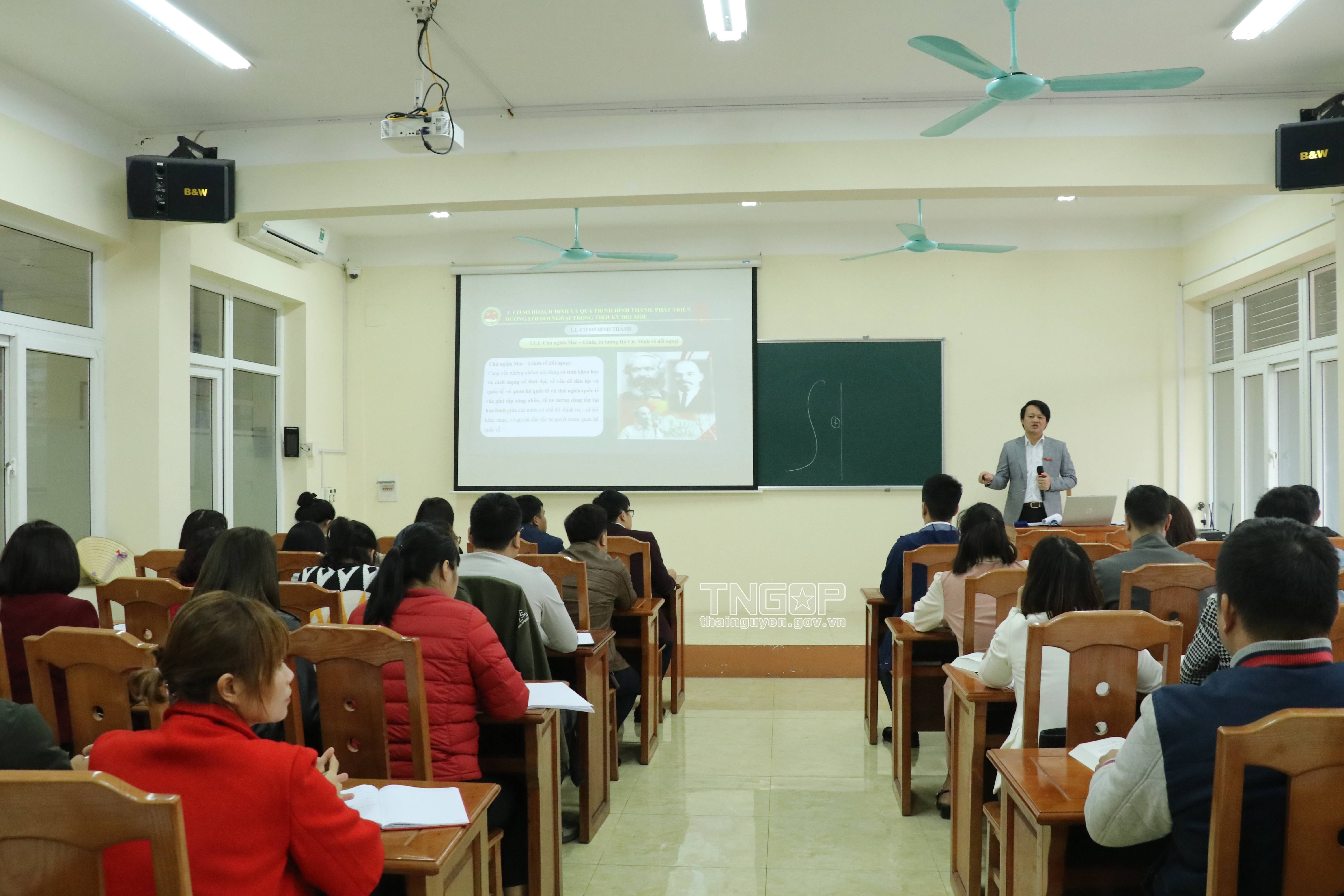 Giảng viên Vũ Mạnh Hà, Trưởng Khoa Xây dựng Đảng truyền đạt chuyên đề Chủ nghĩa Mác - Lê nin, tư tưởng Hồ Chí Minh về đối ngoại cho học viên Lớp Trung cấp Lý luận chính trị